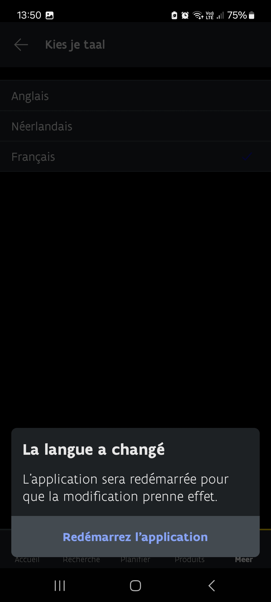Vous pouvez définir la langue de l’application en néerlandais, français ou anglais.