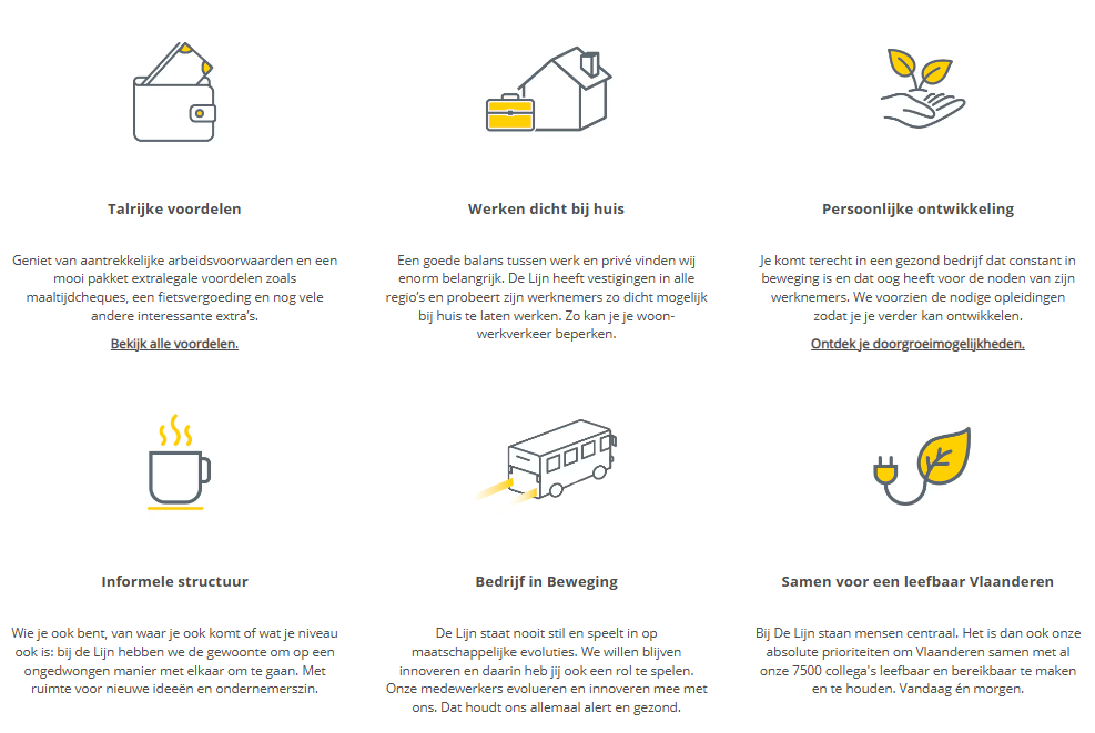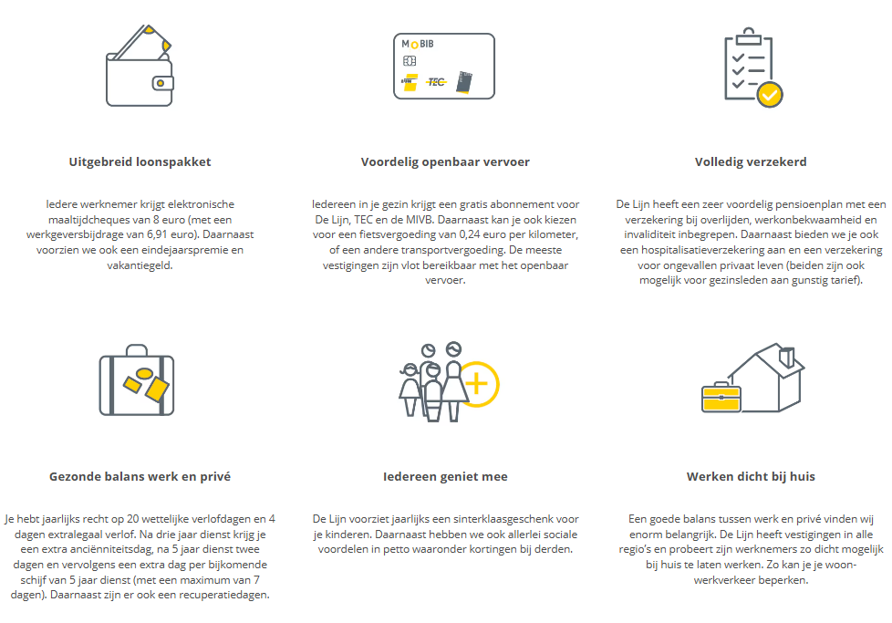 Bij De Lijn start je meteen met een contract voor onbepaalde duur. Je wordt dus opgeleid als bijvoorbeeld chauffeur terwijl je al in dienst bent bij De Lijn. Bovenop je nettoloon krijg je heel wat extralegale voordelen:
